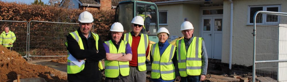 Members of the Village Hall Committee visited the building works on Friday 12th April. The footings for the new extension are being dug out and the Committee look resplendent in full safety gear complete with Hi-Viz jackets and hard hats.